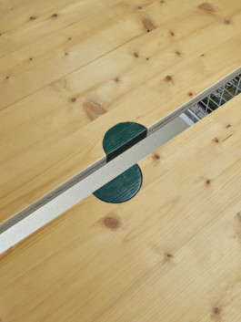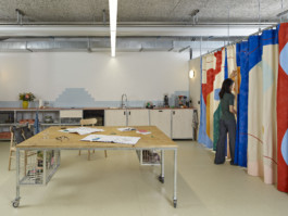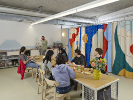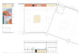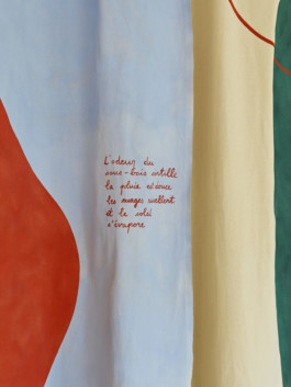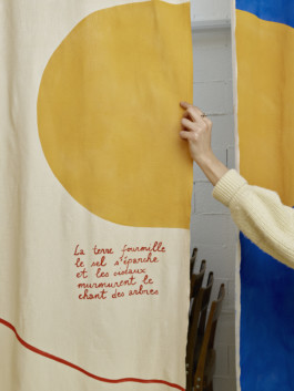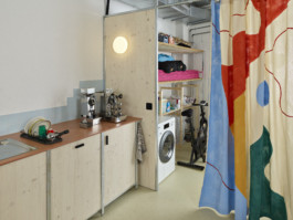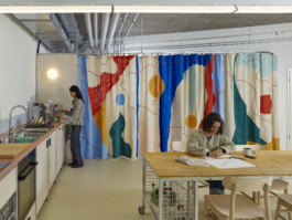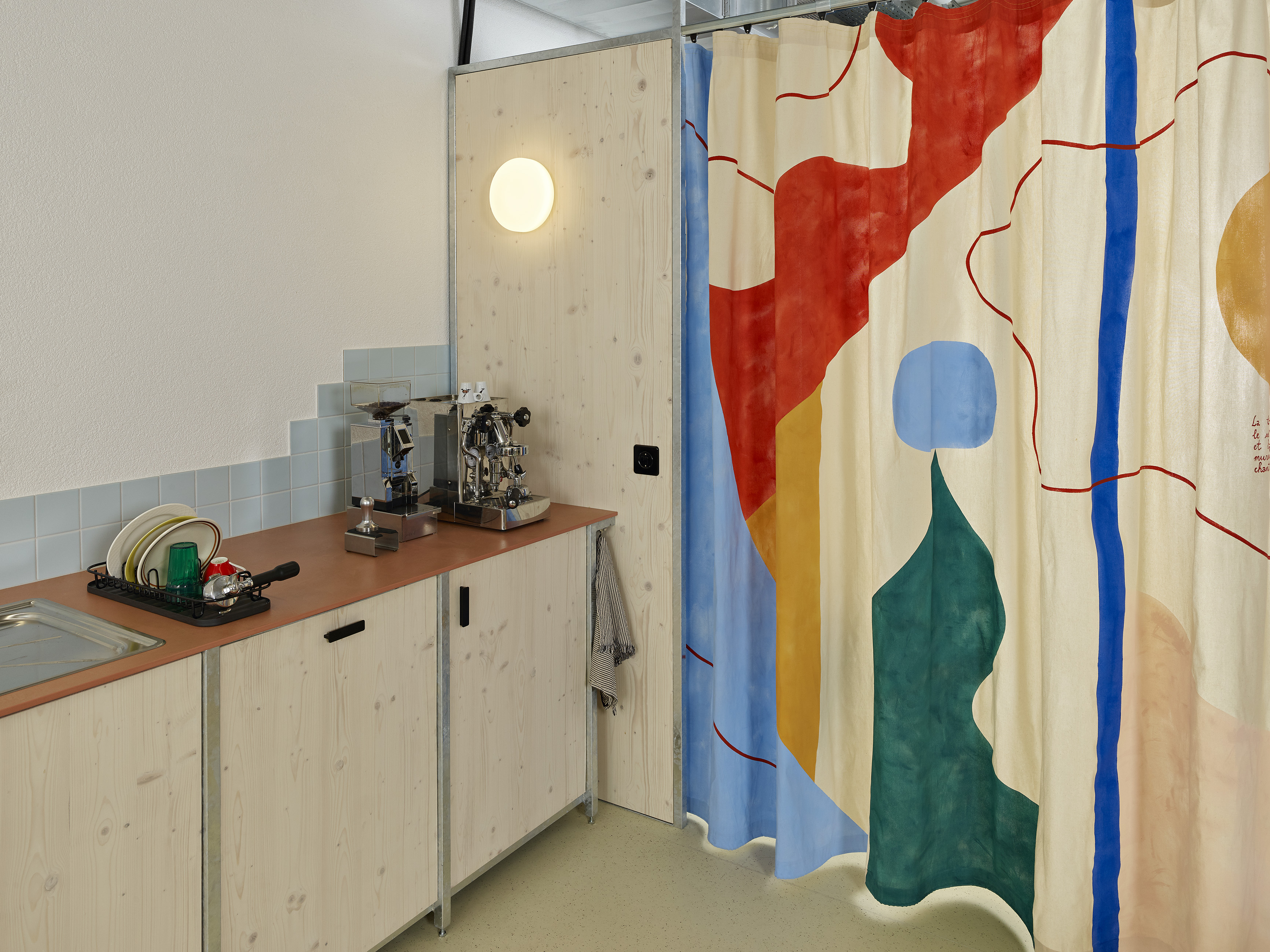 Le rideau, conçu en collaboration avec l’artiste Julia Widmann, apporte une identité joyeuse et colorée tout en cadrant le lieu et en délimitant, de manière souple et fluide, l’espace de rangement situé sur le côté. Les éléments de mobilier en bois et métal ont été réalisés en collaboration avec l’atelier La Grange. Ces deux collaborations ont permis d’enrichir l’attention portée aux matériaux, à la fabrication et à la dimension collective du projet, pour offrir à ce lieu une identité singulière.