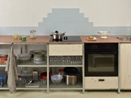 Leur structure en métal galvanisé et caillebotis a aussi été reprise pour la conception du long meuble de cuisine, pensé comme un plan de travail continu et généreux. Plus qu’une simple cuisine, il devient un support d’activités multiples : préparer un repas, bricoler, organiser ou stocker.