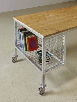 L’aménagement repose sur un ensemble d’éléments mobiles et polyvalents qui permettent d’adapter facilement l’espace. Deux grandes tables sur roulettes, dessinées sur mesure, ont été réalisées à partir d’anciens plateaux en bois récupérés. Elles peuvent se déplacer et se combiner selon les différentes configurations désirées.