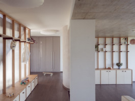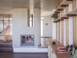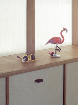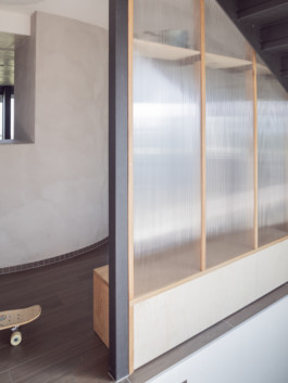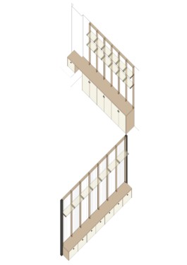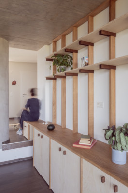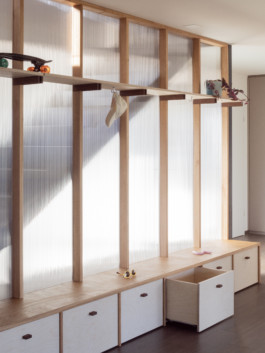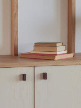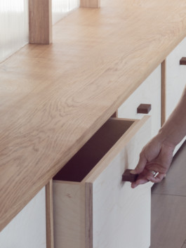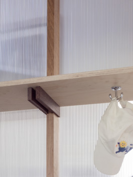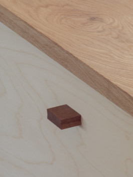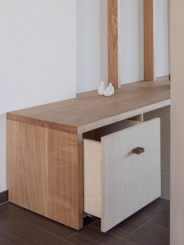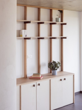 Kit-Kat, deux interventions de mobilier fixe qui se répondent au rez-de-chaussée de cette villa transformée il y a une dizaine d'années. Chacune des interventions assure plusieurs usages: garde-corps, meuble à chaussures, porte-manteau, bibliothèque, meuble tv, rangements; articulant l'espace d'entrée et du séjour sur deux niveaux. Les différentes teintes de chêne massif, alliées aux panneaux de bouleau, amènent une nouvelle chaleur et font un clin d’œil au passé 70's de la maison.