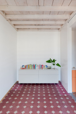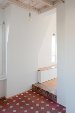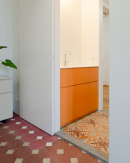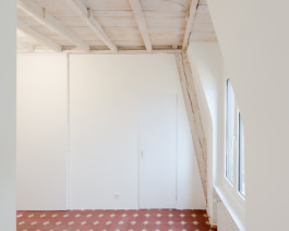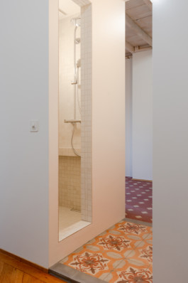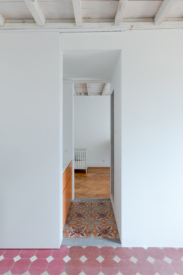 Au-delà de ces questions techniques, Diana Brasil a su composer avec le style de l’immeuble en alliant les matériaux existants à son intervention radicalement contemporaine. En continuité avec le travail des architectes précédents, le faux-plafond a été évacué pour mettre à nu la charpente et les revêtements de sol ont été valorisés. Les motifs de parquet et les couleurs des carreaux de ciment varient de pièce en pièce, leur conférant une identité propre. Le travail minutieux des artisans a permis de rénover l’ensemble des matériaux, et quand ce n’était pas possible, l’architecte a complété avec des éléments nouveaux similaires ou complémentaires.