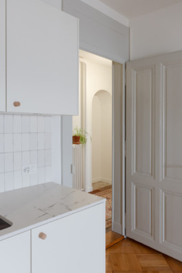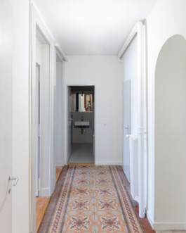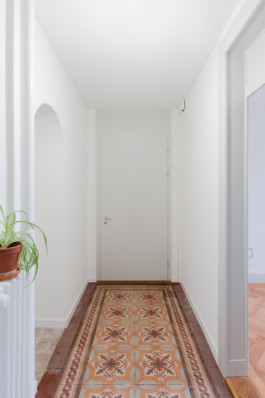 Au-delà de ces questions techniques, Diana Brasil a su composer avec le style de l’immeuble en alliant les matériaux existants à son intervention radicalement contemporaine. En continuité avec le travail des architectes précédents, le faux-plafond a été évacué pour mettre à nu la charpente et les revêtements de sol ont été valorisés. Les motifs de parquet et les couleurs des carreaux de ciment varient de pièce en pièce, leur conférant une identité propre. Le travail minutieux des artisans a permis de rénover l’ensemble des matériaux, et quand ce n’était pas possible, l’architecte a complété avec des éléments nouveaux similaires ou complémentaires.